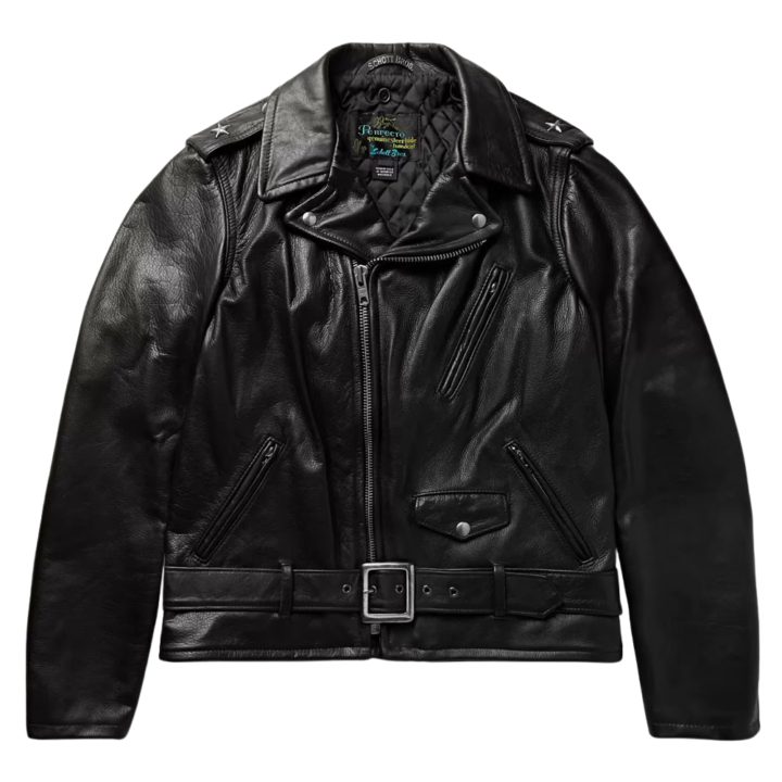 This cropped, belted jacket with its uneven styling, zippered pockets and epaulettes was the first of its kind when it launched, and it has since come to stipulate bike jacket design. It’s the distinctive and biggest, and Schott NYC is the mannequin behind it.